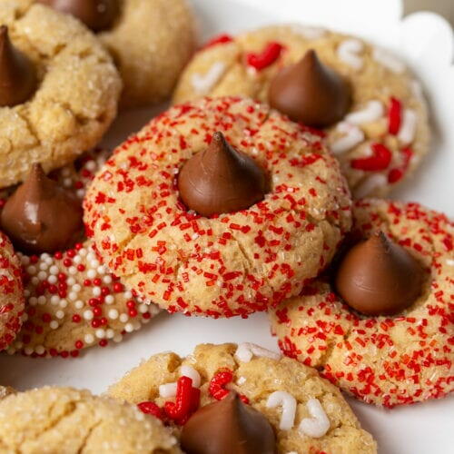 "Christmas kiss cookies have become quite the holiday staple, hence the rename of the original peanut butter blossoms! Make them for your cookie exchanges, holiday parties, or for gift giving. You might know Christmas kiss cookies by the name of peanut butter blossoms. This version of the recipe is not much different other than the addition of festive colored sprinkles. These cookies are fun to cater to any holiday by swapping out the color of sprinkles you use! "